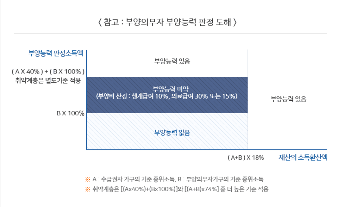 부양능력 미약 | 부양의무자의 부양능력 판정소득액이 B의 100% 이상 A의 40%와 B의 100%를 합한 금액 미만(노인, 장애인, 한부모가구의 부양의무자는 별도기준 적용)이고, 재산의 소득환산액이 A와 B의 합의 18% 미만인 경우 |